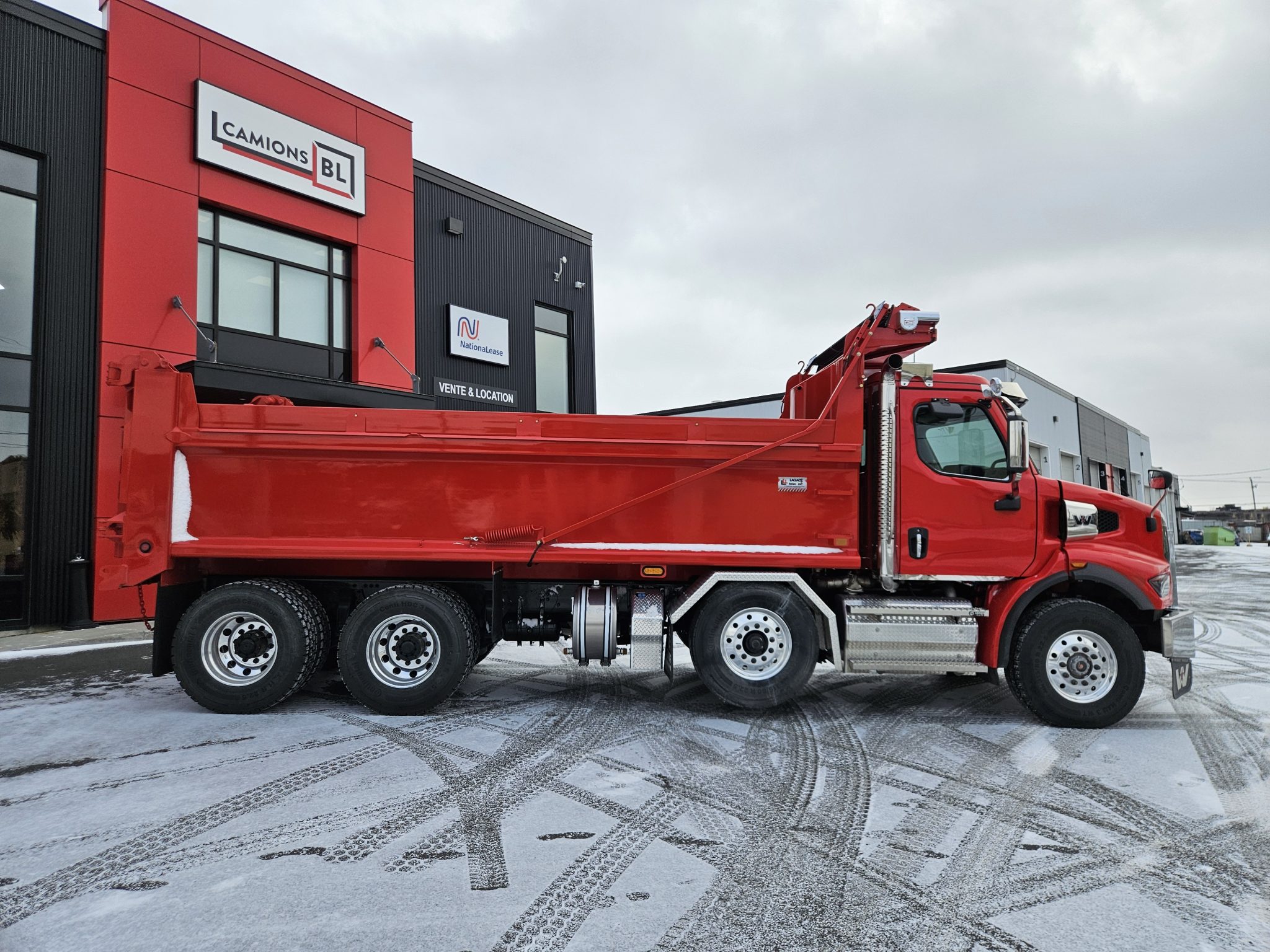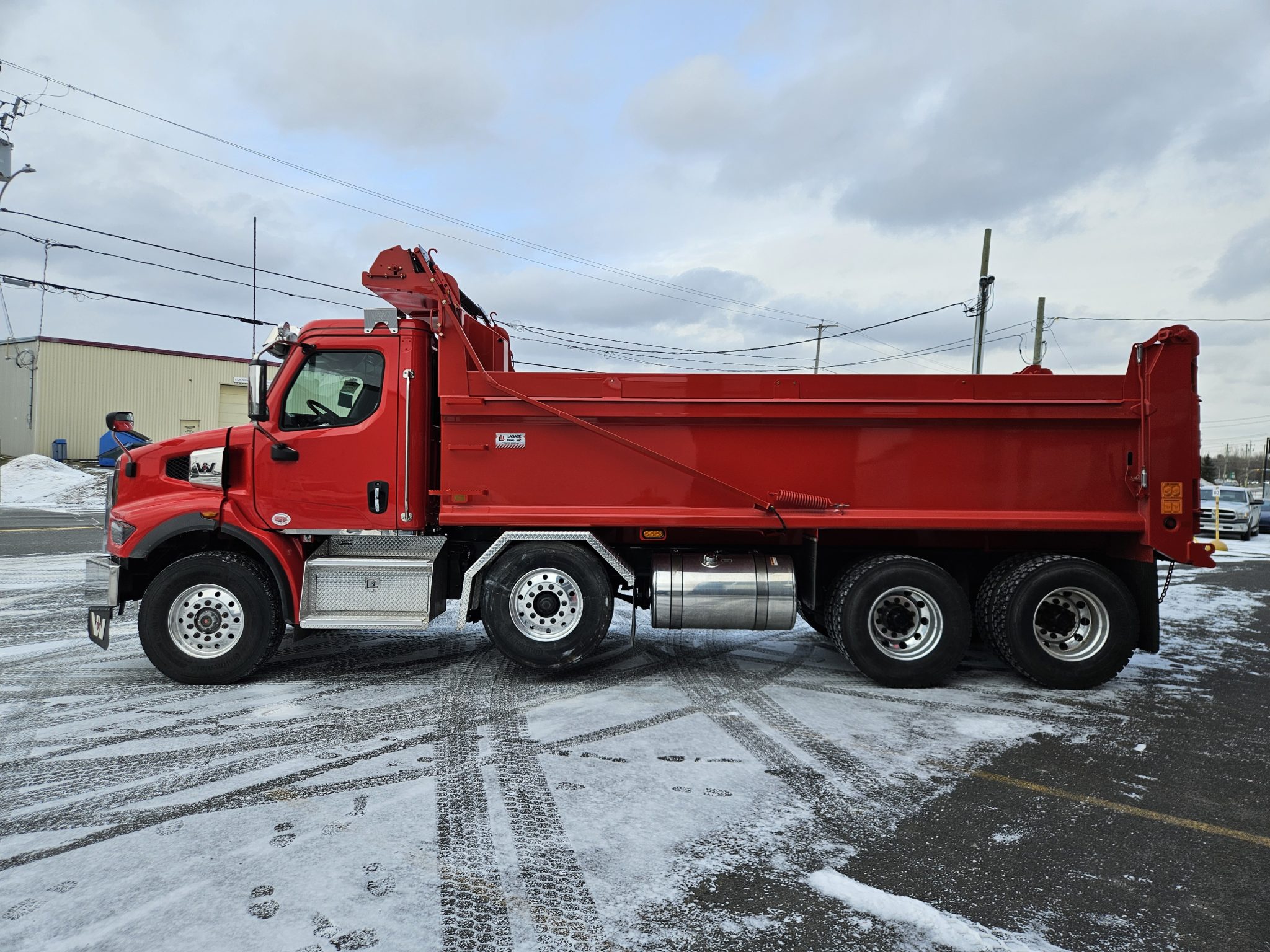 2026 Western Star 47X set-back axle, Cummins X12 engine (500 hp, 1 700 LB/FT), Allison 4500RDS automatic transmission, drum brakes, full lock differentials, 100 gallons fuel tank, aluminium wheels with Continental tires, batteries mounted inside of cab, driver seat with air suspension, heated and ventilated. This truck is equipped with a Tardif et fils lift axle, a step tool box under the cab and a Lagacé et frère dump box. Please contact one of our sales representative for more informations.